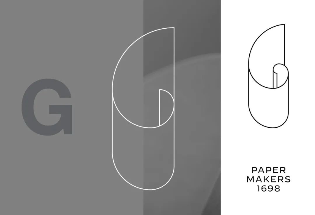 結合了紙張卷起來的打包方式以及黃金比例,一個波浪形的G字符號就此誕生。然后在圖形的下方添加上「Paper Makers 1698」字樣,以強調其悠久的品牌歷史。
